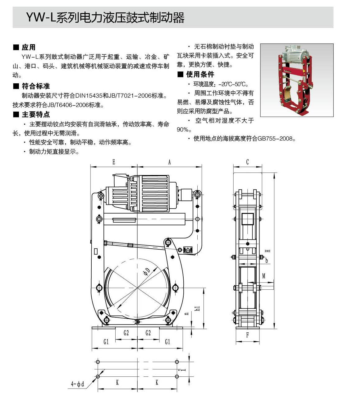 YW-L系列制動器連接尺寸及制動力矩參數(shù)符合JB/T6406-2006標準和DIN15435標準。配套符合DIN15430標準的Ed系列推動器。
