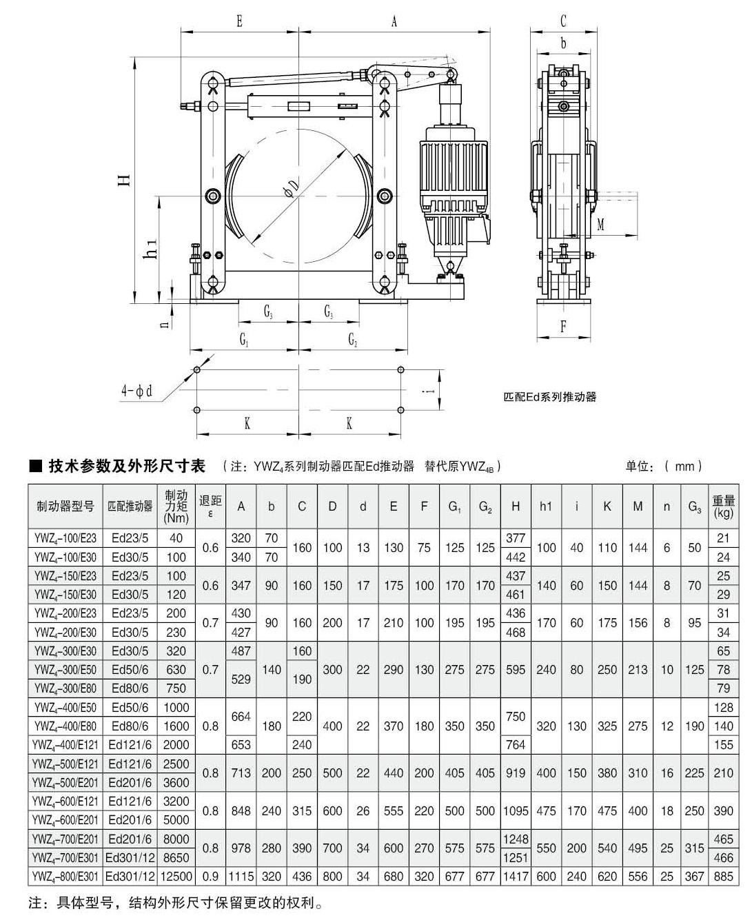 YWZ4(Ed)系列電力液壓鼓式制動(dòng)器的連接尺寸和制動(dòng)力矩參數(shù)符合JB/ZQ4388-86標(biāo)準(zhǔn),技術(shù)要求符合JB / T6406-2006標(biāo)準(zhǔn)。